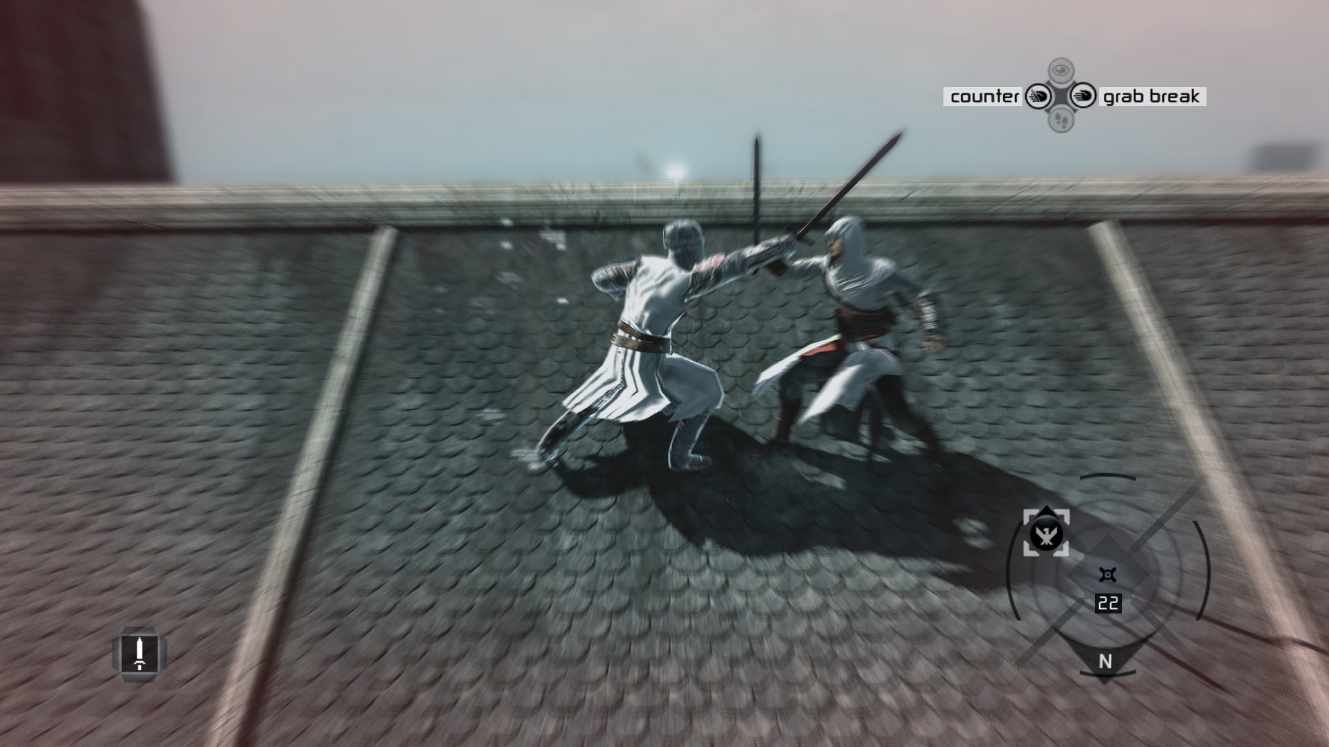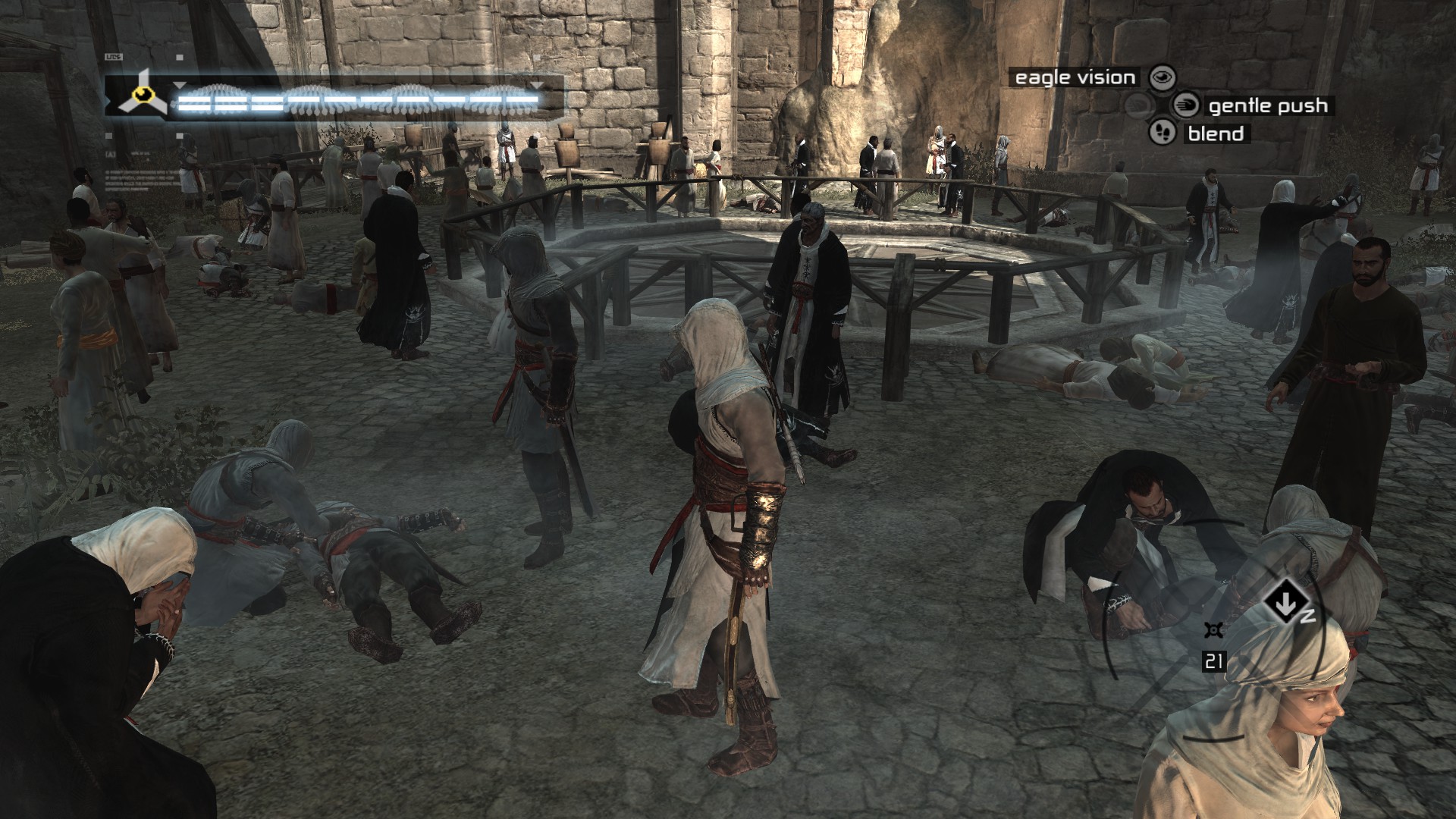 Gameplay. It is probably the biggest downside of Assassin’s Creed. It’s not bad at start, the problem is it never evolves and becomes veeeeery repetitive. Let’s start with the combat – you will do a lot of sword fighting. At first you can only mash LMB to do a simple sword attack, your enemies will block it until their invisible stamina bar is depleted and then you kill them. You can block too and later you can counter-attack while blocking, this is your most powerful attack in the game. When countering weaker enemies they will instantly get killed with a very cool animation. Tougher enemies will get knocked on the ground and if you can land quick hits with LMB you can easily kill them or keep countering them to deplete their stamina bar and eventually kill them, you can tell really easily which enemies are tougher as they have more armor and unique look to them, and overall there are three different soldier/guards types. There’s also guard break (self-explanatory), dodge after enemy breaks your block, grab that lets you grab an enemy and throw them (stronger enemies can break it and hit you instead until you weaken them) and last but not least, the attack named… something, I forgot. But after successfully landing a simple LMB attack on enemy sword, if you click LMB again at that moment, you can insta kill weaker enemies or knock them down, but honestly I could never master that move, it felt like the game wasn’t always registering my second click or maybe I was doing it wrong the whole time? No idea. But yeah you will fight like this the whole game. Group of enemies surrounds you. Wait for some of them to attack, kill them with counter. Mash LMB and try to time the second click for fast kill or keep mindlessly mashing until you kill them. Animations are really cool and brutal, but it gets boring after seeing it for 15636th time. It has the same problem like Shadow of Mordor where combat is very simplistic and it tries to make up for it with cool kill animations and spectacle. Also some of them are dumb, because Altair will like kneel over dead enemy for few seconds and other enemies just stand and wait for you to stand up, others are very fast and give very little time for your enemies to react, making them feel like realistic* and something a skilled sword man could pull up (*- but I’m no expert). Later you also get throwing knives, excellent for taking out archers. Dagger - functions exactly the same as sword in sword fights, but comes with different kill animations. And of course the iconic hidden wrist blade, great for silent kills but honestly it was my least used method of killing.