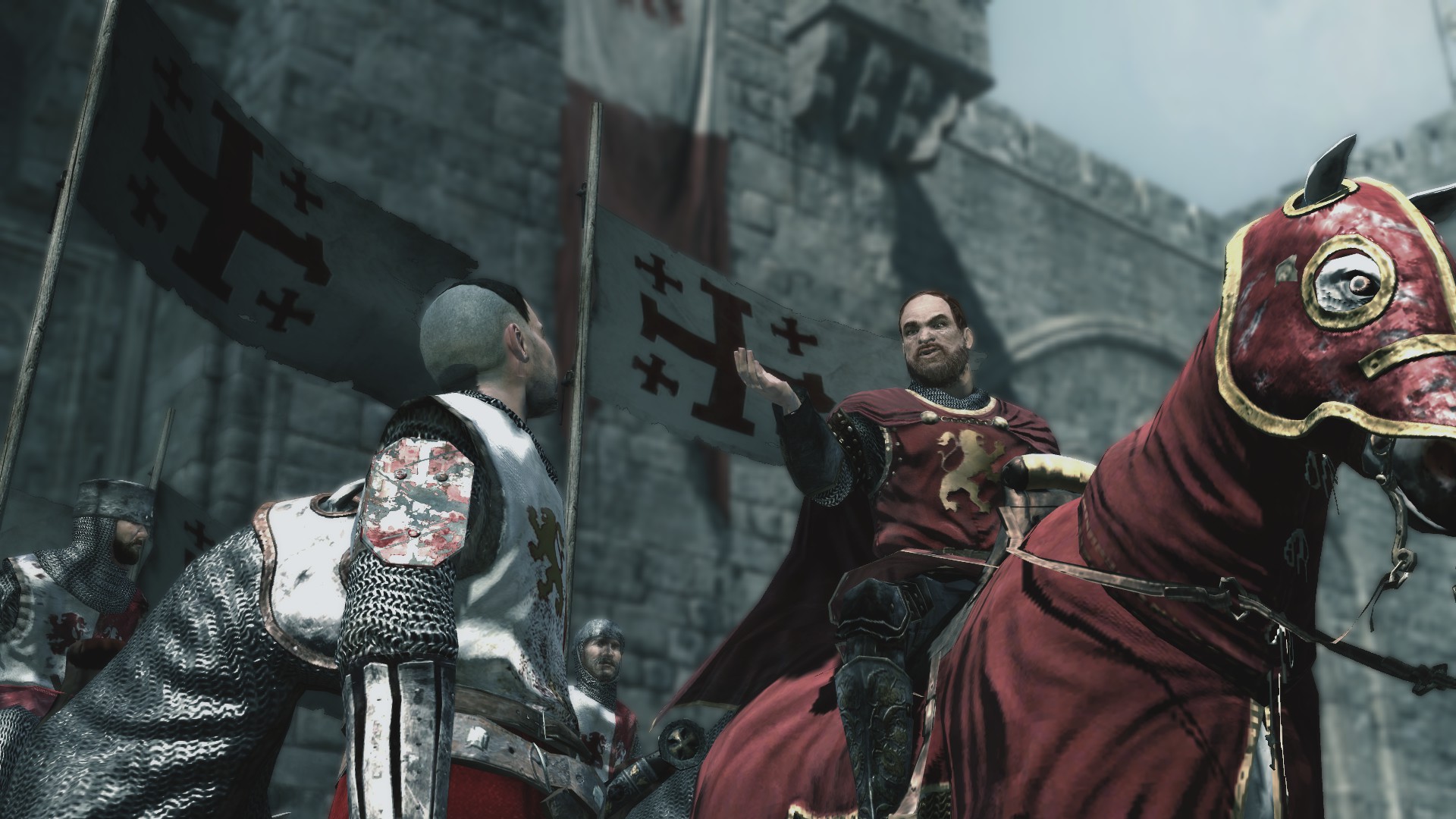 After a brief training inside Animus we jump to Altair and his two companions on a mission to retrieve a precious artifact. Altair is not a very relatable character. Right at the start he kills an innocent, old man, just because he saw them enter the Solomon’s temple and is immediately scolded by our companions for breaking the code of Assassin’s, however Altair being the highest ranking assassin amongst them basically tells them to shut up. It doesn’t take long for Altair’s arrogancy to get us into trouble. Soon we reach the treasure, but the templars have already secured it and the leader of Templars, Robert de Sablé, came personally to see it. Altair thinking this is an excellent opportunity to get the treasure and kill their biggest enemy at the same time, decides to climb down from their spot up high, where they were unseen and basically tells Robert “hey I’m here and I’m going to kill you”. Of course things don’t go the way Altair intended them to. Robert quickly bests us, happens to throw us right into a wooden beam supporting the entrance to the chamber we were just in, it collapses cutting us off from our companions, we can hear a fight breaking out and presumably they’re dead. We return to Masyaf, the city where Assassins are based, to our master Al Mualim to inform him that “oops, a lot have happened, my friends are dead and the treasure is gone” but SUDDENLY one of our presumably dead companions arrives, Malik, who managed to get the treasure and tells Al Mualim everything went to shit because of Altair and with Malik came Robert with an army to lay siege on Masyaf to recover the treasure.