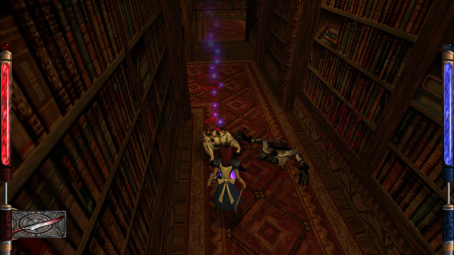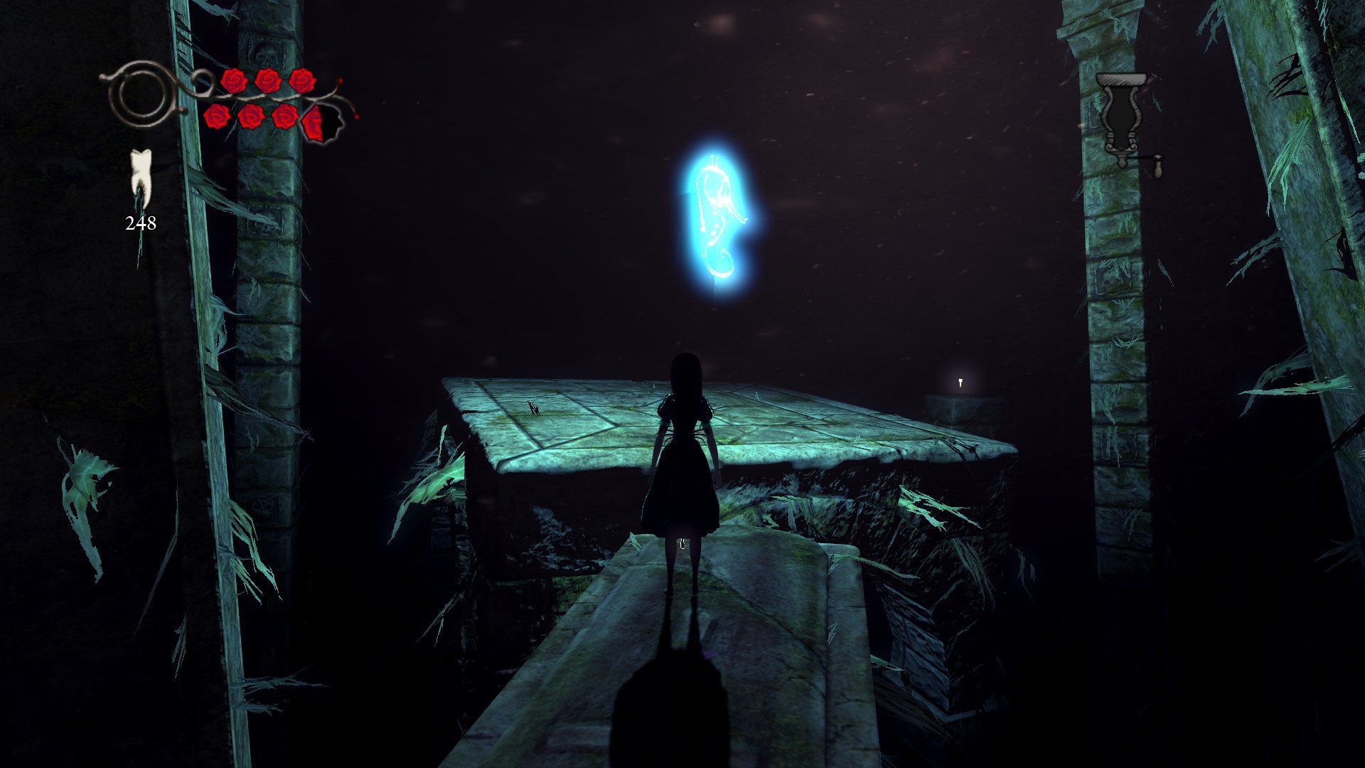 Atmosphere and the world carry this game a lot IMO because the combat is pretty basic and platforming is easy. Sometimes they throw a unique puzzle in, like that one in Chess Kingdom where you are turned into a chess piece and you can only move like that chess piece on board. There are some platforming sections, sometimes with enemies throwed in that spawn only when you reach a tight spot 😵 You have 8 weapons, with knife being your starting weapon. Besides health you also have Mana or Will or whatever it’s called in this game. Most weapons have alternate fire mode which is nice. Besides slicing with the knife you can also throw it and it will reappear in Alice hand after 3-4 seconds. This and left-click attack of Croque Mallet are only weapons that don’t use mana. Everything else use one shared pool of mana.