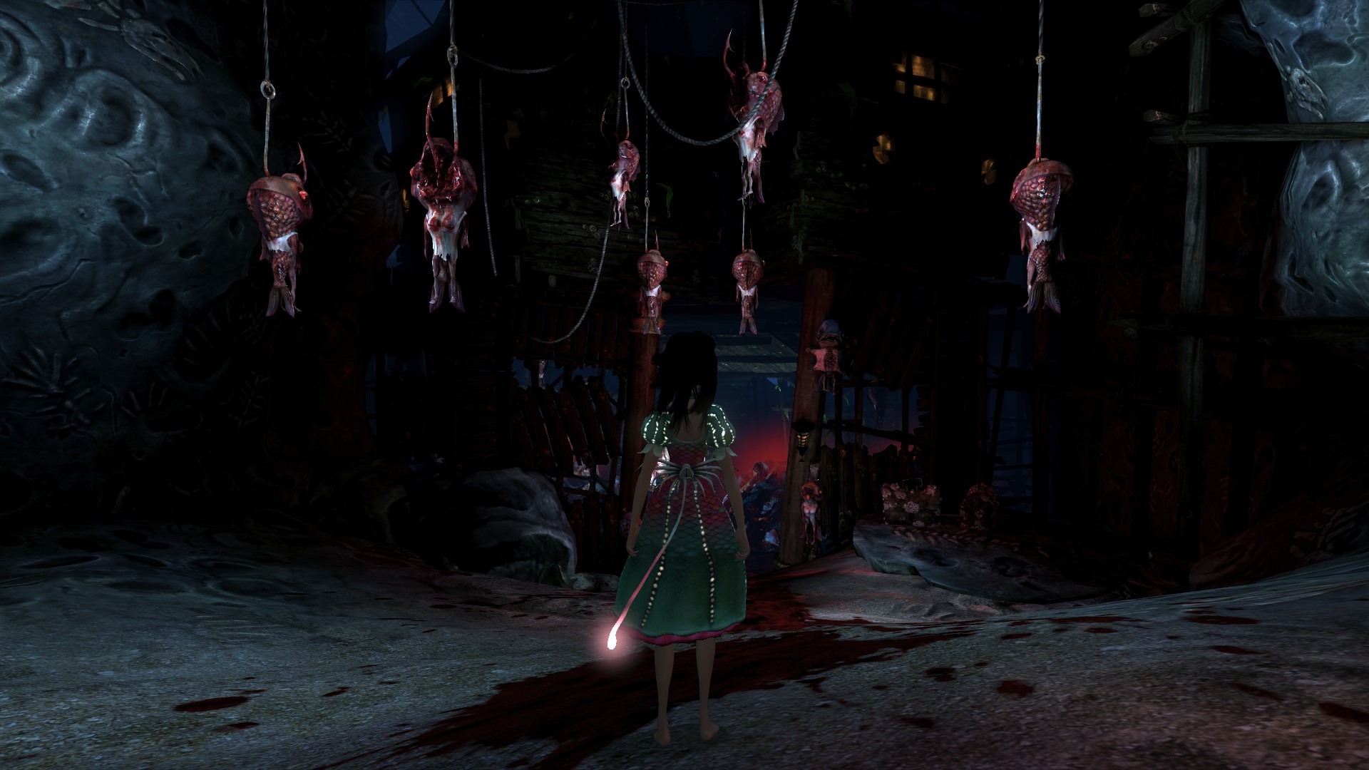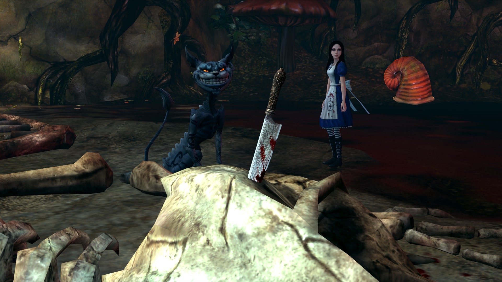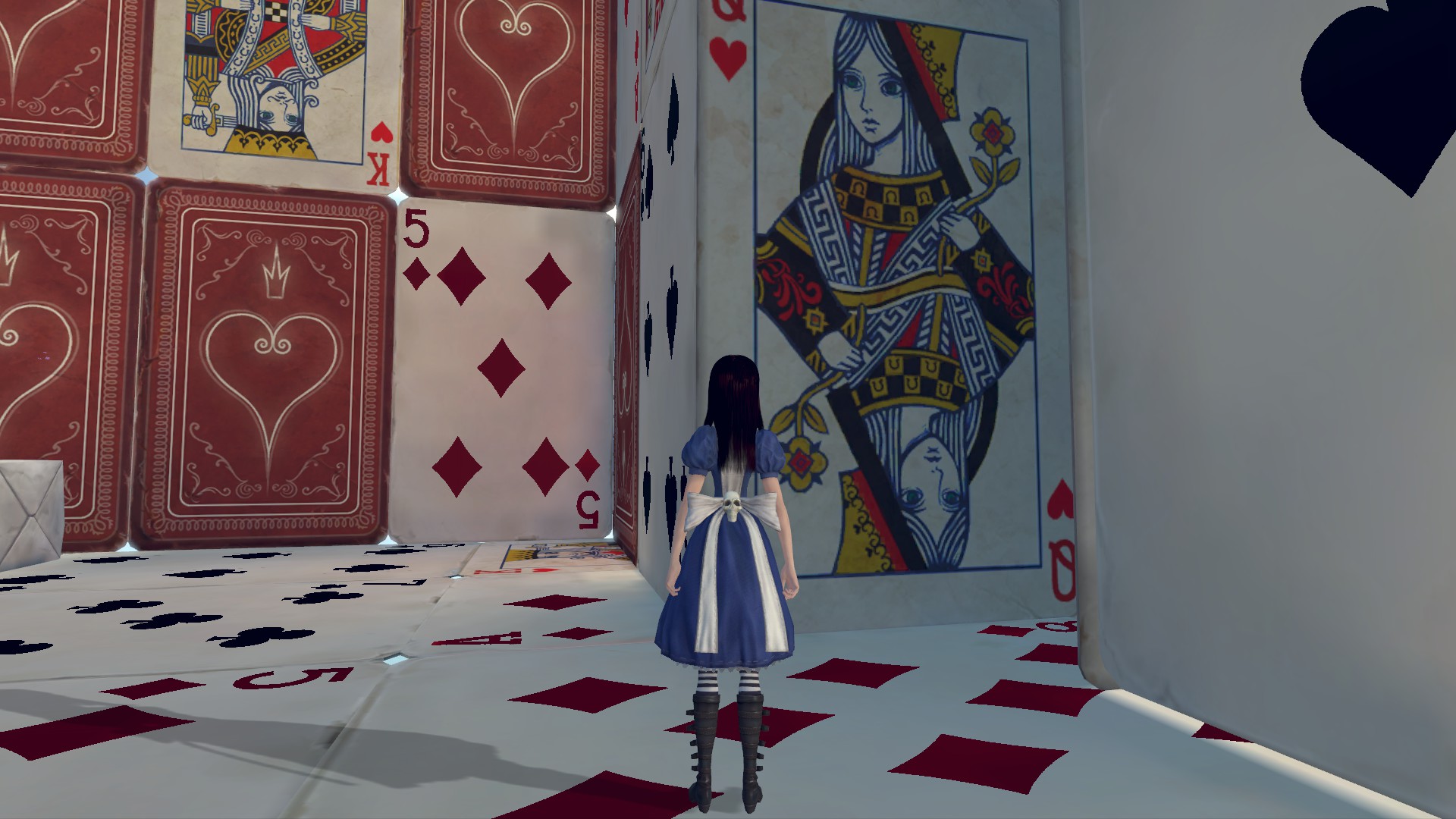 I never read the book but it’s pretty obvious from start that wonderland is a reflection of Alice’s psyche. From bits I saw, the original wonderland is nothing like this new Wonderland. When Alice lands in wonderland it’s dark, twisted. And first native we meet is a cat with very skinny body, tail with pointy end and big paws and head, with an evil smile. Although he doesn’t look very trustworthy, he’s our only guide sticking with us through the entire game and one of few allies in this new dangerous Wonderland. Going a bit further we find ourselves in a village that’s under rule of Queen of Hearts. In fact the whole Wonderland is ruled by the Queen with Jacks of Spades/Hearts/Diamonds/Clubs being the common enemy and enforcers of her rule.