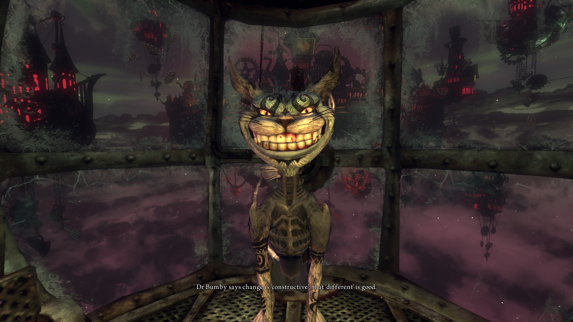 Alice is now 19 years old. She’s stuck in orphanage in London, two places that are not very good for your mental health. She’s under the care of Dr. Bumby, a psychiatrist who specializes in using hypnosis to help his patients, the children in the orphanage and of course our Alice. His advices are questionable as he insists that the best solution is to just forget which is not how you deal with mental health problems. While doing some errand for the Doctor and going through streets of London in some poor district full of shady men, whores and grim looking policemen, we get our first hallucination. Alice finds herself in Wonderland. It’s different, it’s still really strange but this time it’s beautiful, idyllic almost. And our old friend the Cheshire Cat is back!
